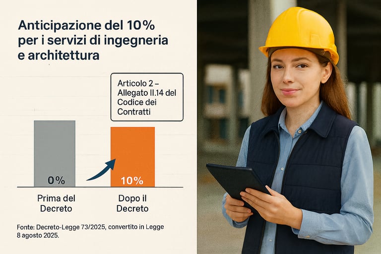 Una delle innovazioni più rilevanti riguarda i servizi di ingegneria e architettura, per i quali viene introdotta la possibilità di prevedere un’anticipazione fino al 10% del corrispettivo contrattuale.
